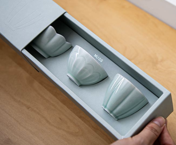 고려 상형청자의 우아한 아름다움을 그대로 옮겨 담은 막걸리잔 세트. 어른들 선물로도 인기가 많아요.
